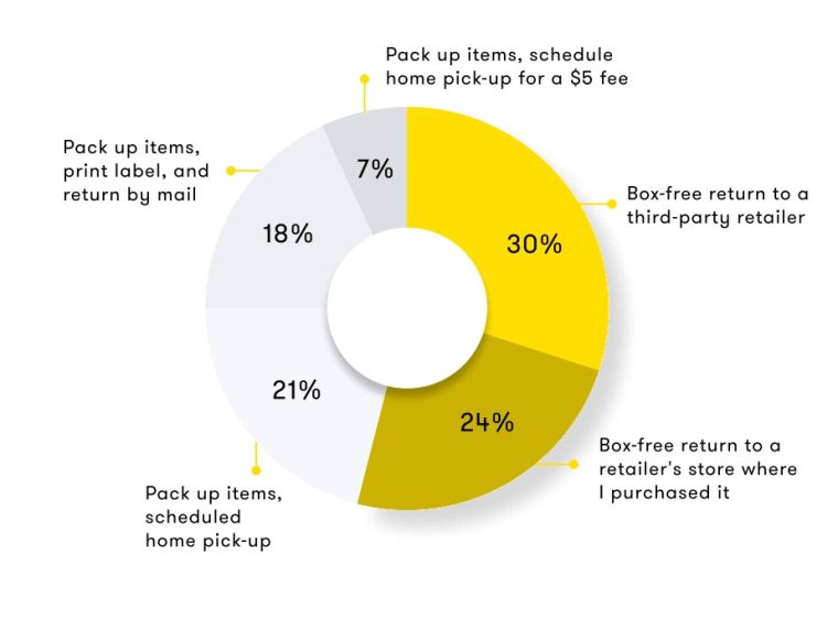 Surprisingly, packing up items and scheduling a home pick-up was only third on the list of preferred methods when it came to returns. Only 18% of respondents said this was their preferred method. The typical online shopper seems to prefer visiting a physical store when it comes to returns.