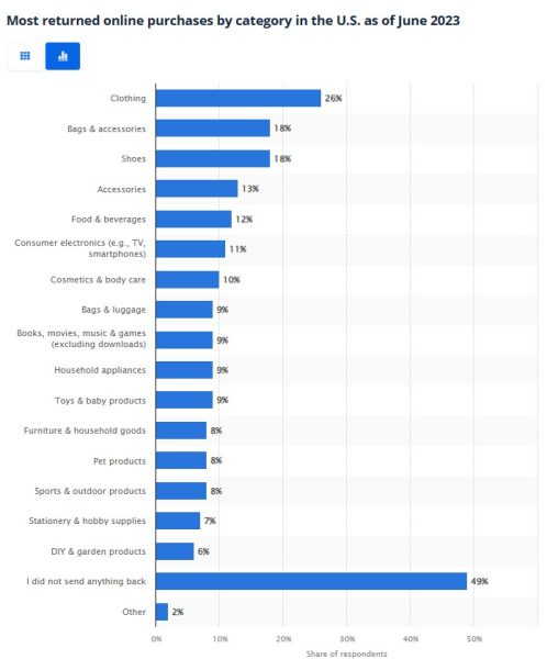 Clothing is by far the most returned category when it comes to online shopping. In 2023, 26% of US online shoppers said they returned clothing they’d bought online in the last 12 months.