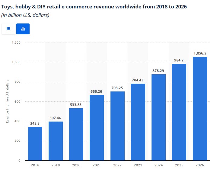 Still, online retailers selling toys can take heart in the fact that the worldwide sales revenue from online sales of toys, hobbies, and DIY items is growing.