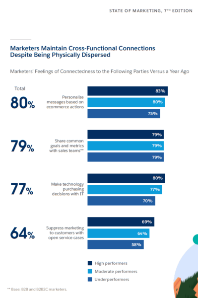 83% of high performers “personalize messages based on e-commerce actions” [vs. 80% of moderates and 75% of underperformers].