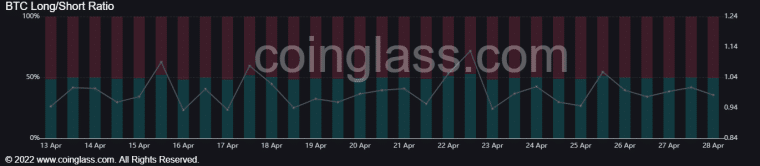 However, OI remains pretty evenly split with the Long Short ratio (0.98) suggesting traders are largely on the fence, with minor divergence as 50.44% of traders move short (taker sell).
